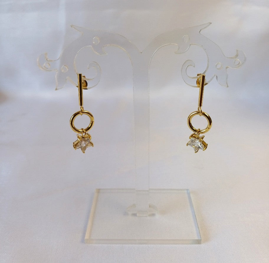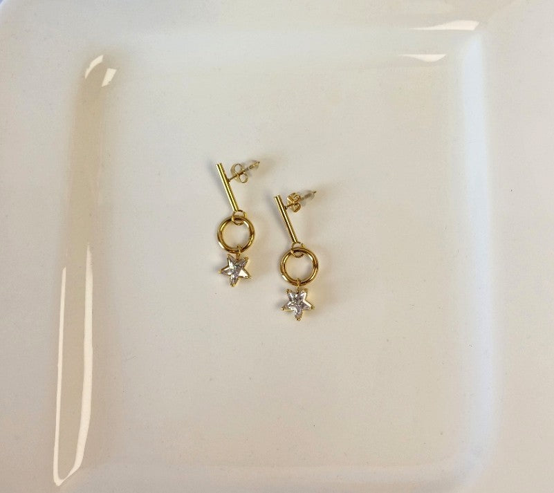 Add a touch of sparkle with these elegant golden Star Stud earrings. Featuring a delicate stick design topped with a small circle drop adorned by a charming star, each star is finely embellished with shimmering American diamond. Perfect for adding subtle sophistication to any look.