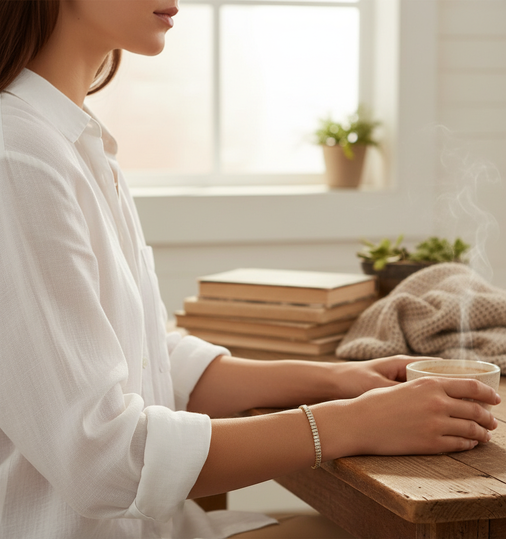 Style your Tennis Bracelet 6 with sleek evening wear—think a little black dress or a satin blouse—its rectangle-cut American diamonds add a modern, sophisticated edge.