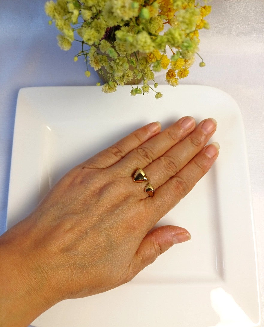 Pair your golden triangle ring with sleek geometric earrings or a minimalist bracelet for a chic, modern look.