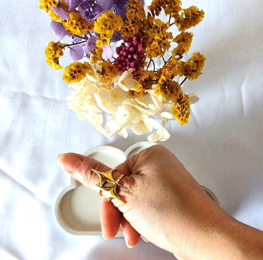 Let your golden Zephyr ring be the star—pair it with nude nails and a sleek monochrome outfit for a modern, high-impact look. Keep other accessories minimal to let its statement shine.