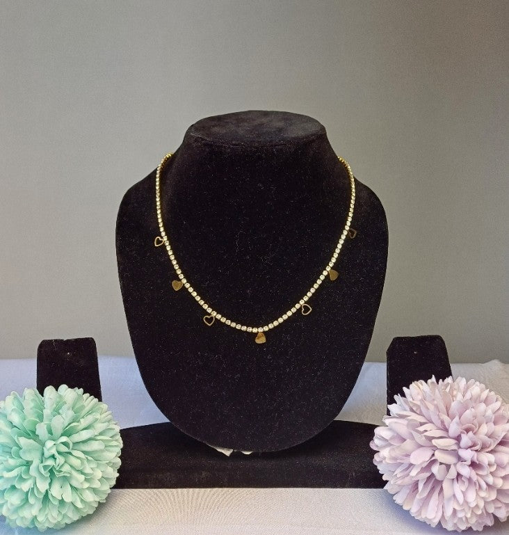 The Zivah Necklace features a delicate string of sparkling American diamonds accented with charming heart-shaped charms. This elegant piece adds a touch of grace and warmth to any outfit.